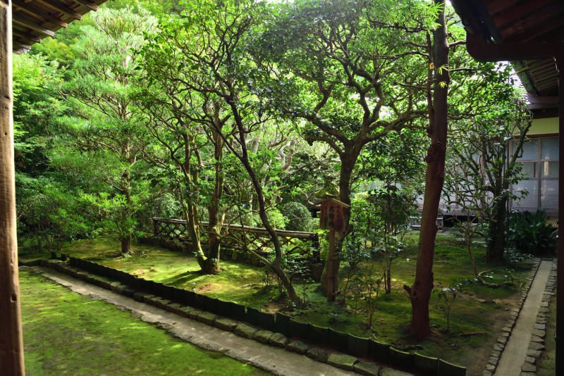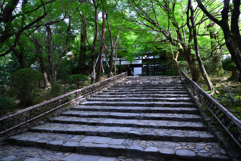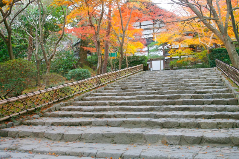 方丈へと続く参道はモミジのトンネルとなっており、晩春から初夏にかけては爽やかな青紅葉を、秋には鮮やかな赤に染まった光景を楽しめます。石階段の脇にある竹垣は、竹を斜めに組み合わせた形が特徴的で「龍安寺垣(りょうあんじがき)」と呼ばれるもの。数ある竹垣の種類のひとつとして、全国の日本庭園や自宅の庭などにこの龍安寺垣が設置されています。