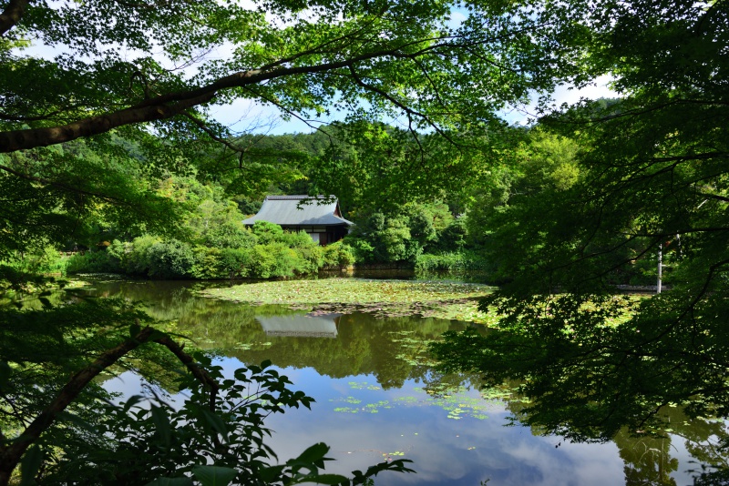 龍安寺境内の南半分を占める大きな鏡容池(きょうようち)は、まだ龍安寺が別荘だった頃、貴族が舟を浮かべて詩歌管弦を楽しんだという記録が残っています。オシドリの名所として知られる美しい池には、今も鷺(さぎ)や鴨が羽を休め、夏の睡蓮をはじめ、四季折々の草花を楽しめます。