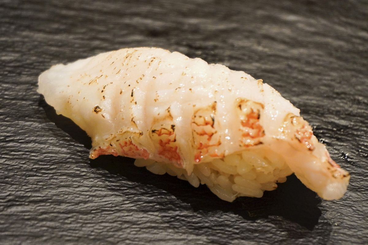 新千歳空港店を訪れた9割以上の人がオーダーするという「炙りきんき」1200円は、もちろん東京店でも提供されています。皮目を焼くことで引き出された香ばしさと、弾力のあるもっちりとした食感、上品な脂のうま味が、シャリと合わさった極上のネタ。お店を訪れたら、ぜひ食べたい一品です。