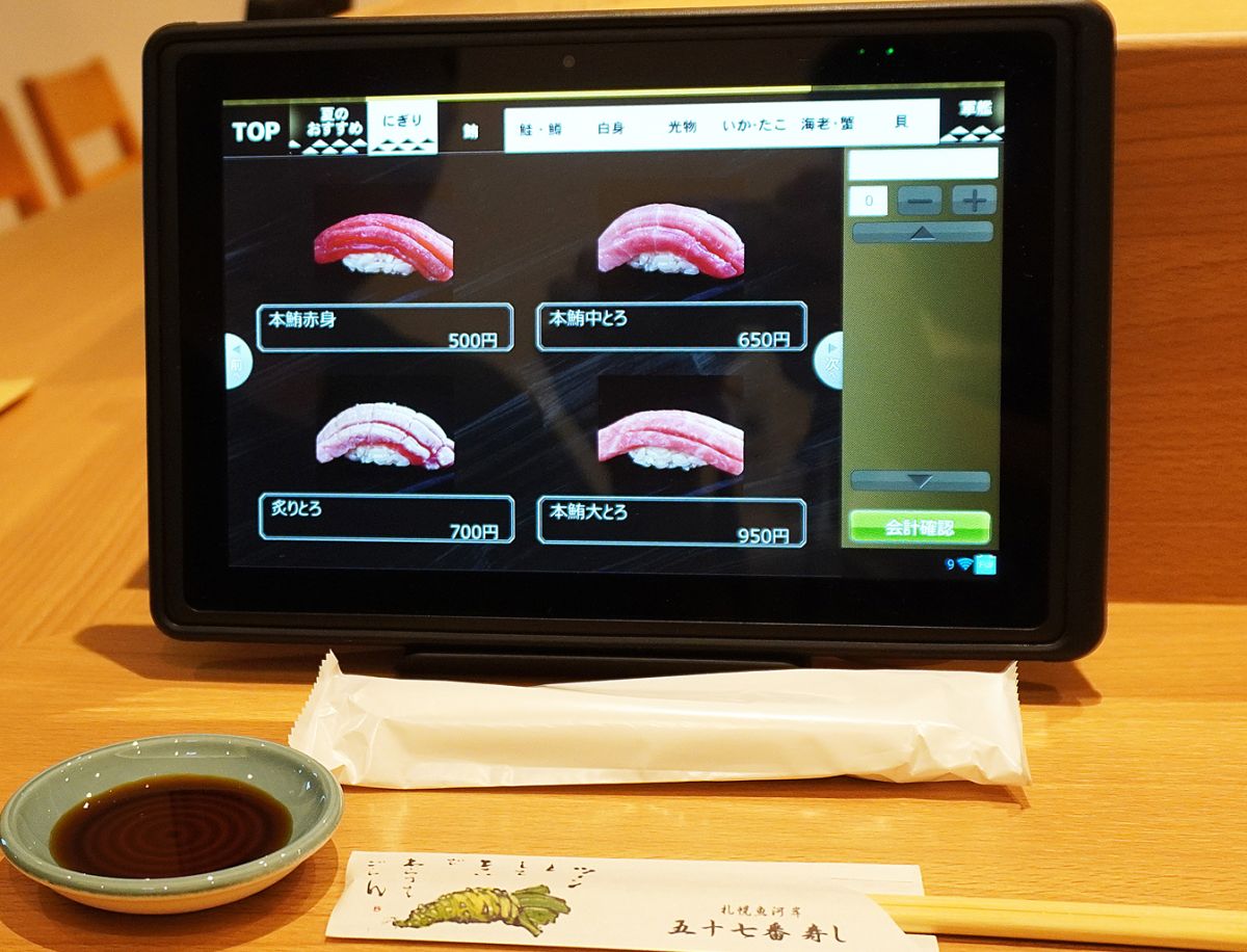 入口のディスプレイには、職人さんが寿司を握っているところや、おいしそうなネタが次々と映し出され、その気がなくても、ふらふらとお店に吸い込まれてしまいそうになります。