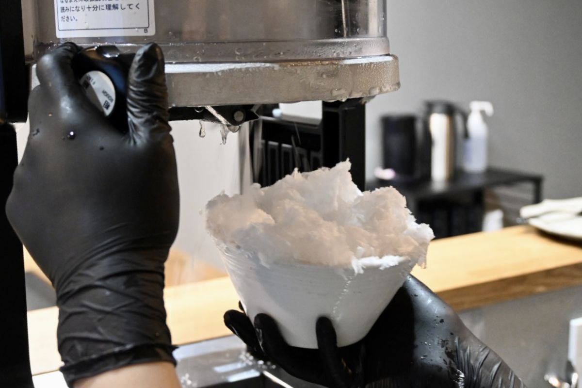 「ふわふわの泡」だけでなく、「ふわふわの氷」にもこだわり、刃の当て方を調整して、氷を薄く薄く削っています。シロップとの相性がよかったことから、ろ過して不純物を取り除いた純氷を使用しています。