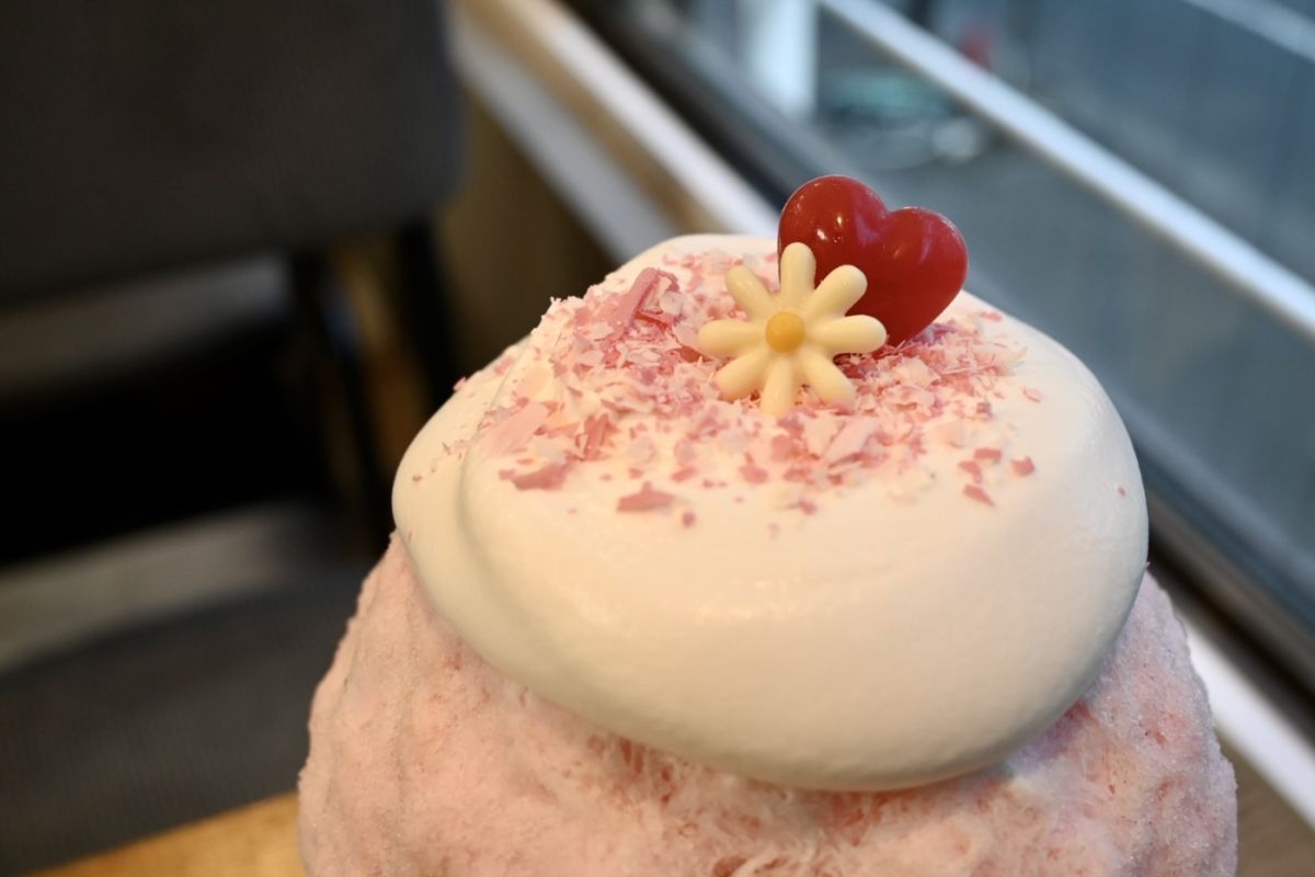メニューは現在5種類。オープン前にインスタグラムのアンケートで採用されたメニューが「さくらさん。」です。自家製のさくらミルクシロップがかかったかき氷に、ミルクエスプーマ、チョコの飾りをトッピング。ハート型の飾りは、実はスポイトになっていて、中にはいちごソースが。お好みでかけてくださいね。