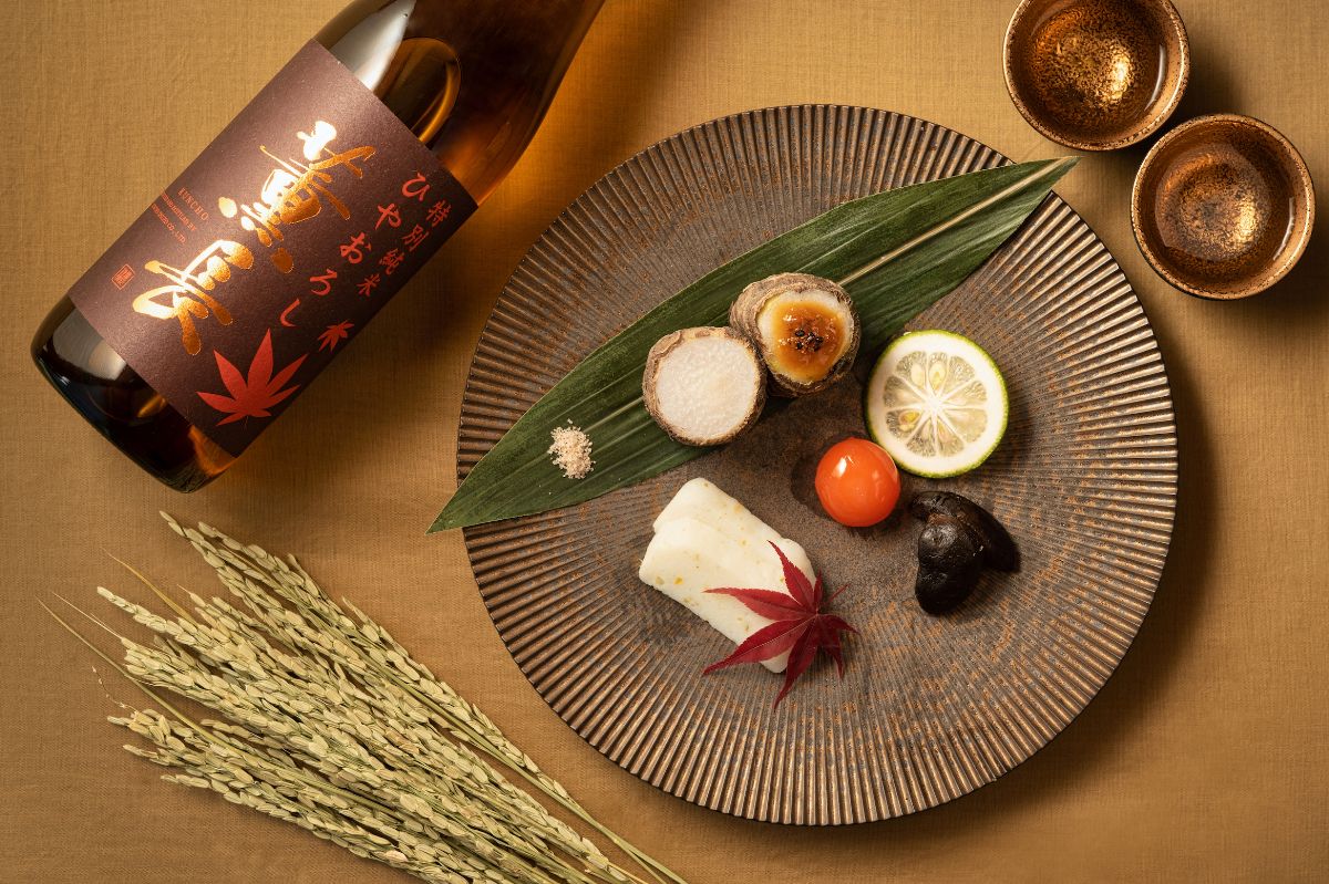 ⽉⾒酒には、⼤分県⽇⽥市「クンチョウ酒造」の秋限定ひやおろし。おつまみには、⼤分県が⽇本⼀の⽣産量を誇るかぼすや⼲しシイタケのほか、芋名⽉にちなんだ⾐かつぎ(里芋の小芋を皮付きのままゆでたり蒸したりした料理)が供されます。かぼすを使⽤した味噌やかぼす塩を付けて、ひやおろしと一緒に味わってみて。おいしい大分の銘品とともに美しい月をゆっくりと鑑賞できるのはこのプランならでは。