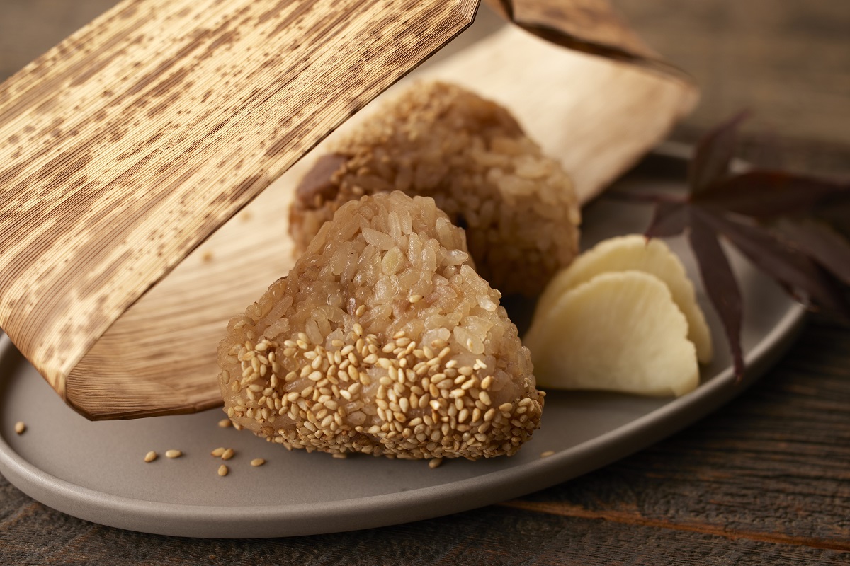 だし汁と醤油で優しく味つけされた栗の炊き込みごはんを、食べやすいおにぎりで用意。煎った白ゴマで香ばしさをプラスし、いいアクセントに。