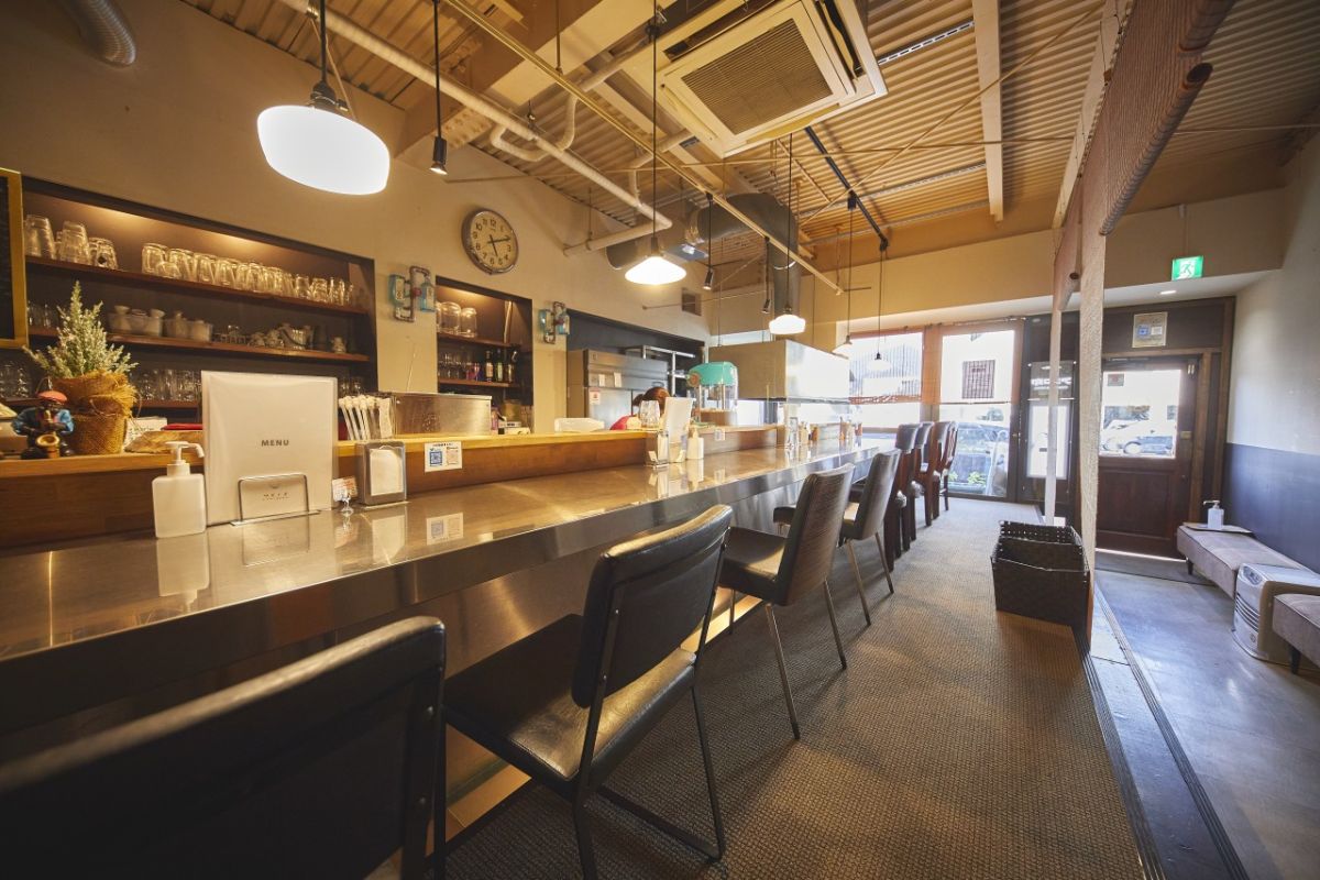 店内は奥に広い間取りで、入口付近には奥行きのある長いカウンター席があります。