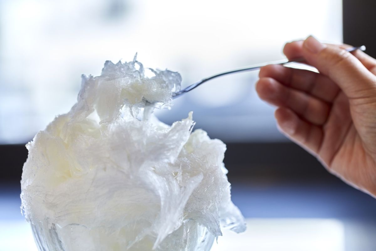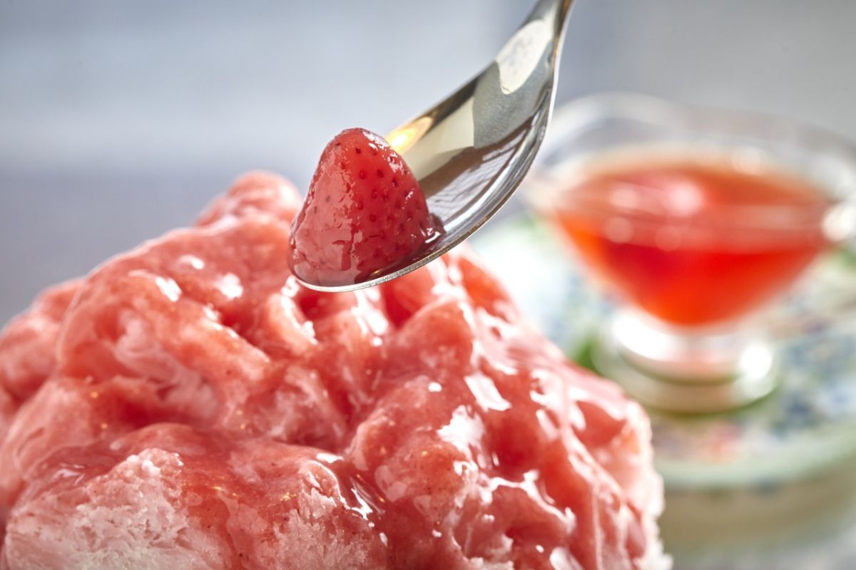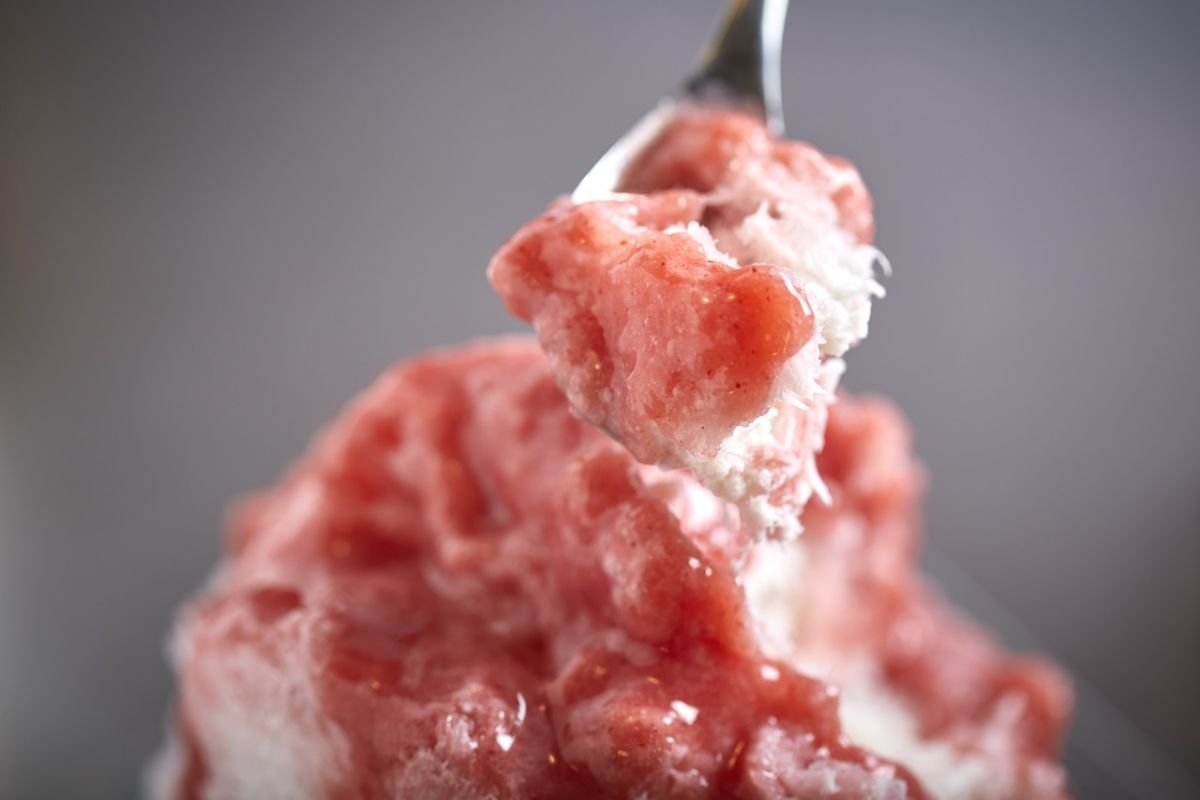 ソースは非加熱だから、静岡産ブランドいちごの酸味と甘みがしっかりと、爽やかに伝わってきます。食べ進めるとれん乳ミルクのソースが顔を出し、ミルキーな味わいが加わり味変。そして氷は、まるで淡雪。ふわふわふわ……と形を保ち、口のなかですぅっと溶けます。