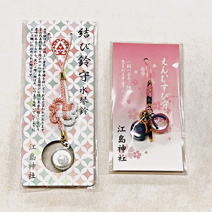 左は「結び鈴守』1200円。やさしい鈴の音が幸せを呼び寄せてくれそう。右は「えんむすび守り」800円。パートナーとお揃いで持ちやすいデザインが人気。