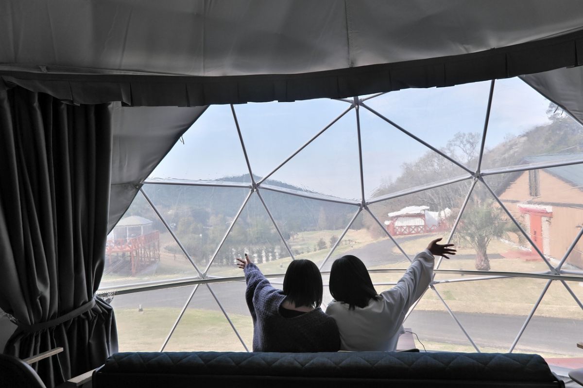 ドームタイプのテントの定員は5名。大きな窓がついているので、外の風景も楽しめます。ソファでドリンクを飲みながら、のんびりと過ごしましょう。もちろんカーテンもあるので、プライバシーも万全です。