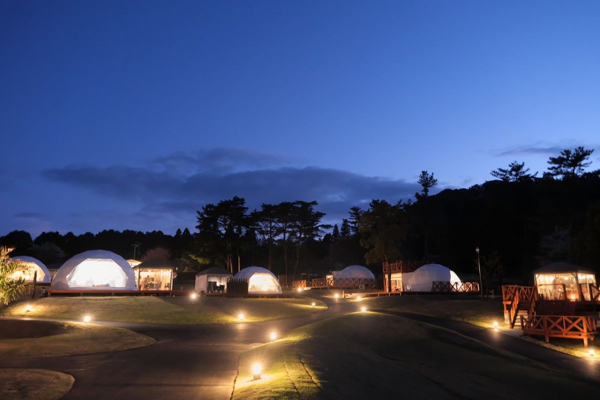 「マザー牧場 グランピング Green Base」があるのは、鹿野山ゴルフ倶楽部の中。6800㎡の敷地に、8種類18棟のテントサイトと3棟のコテージが並びます。