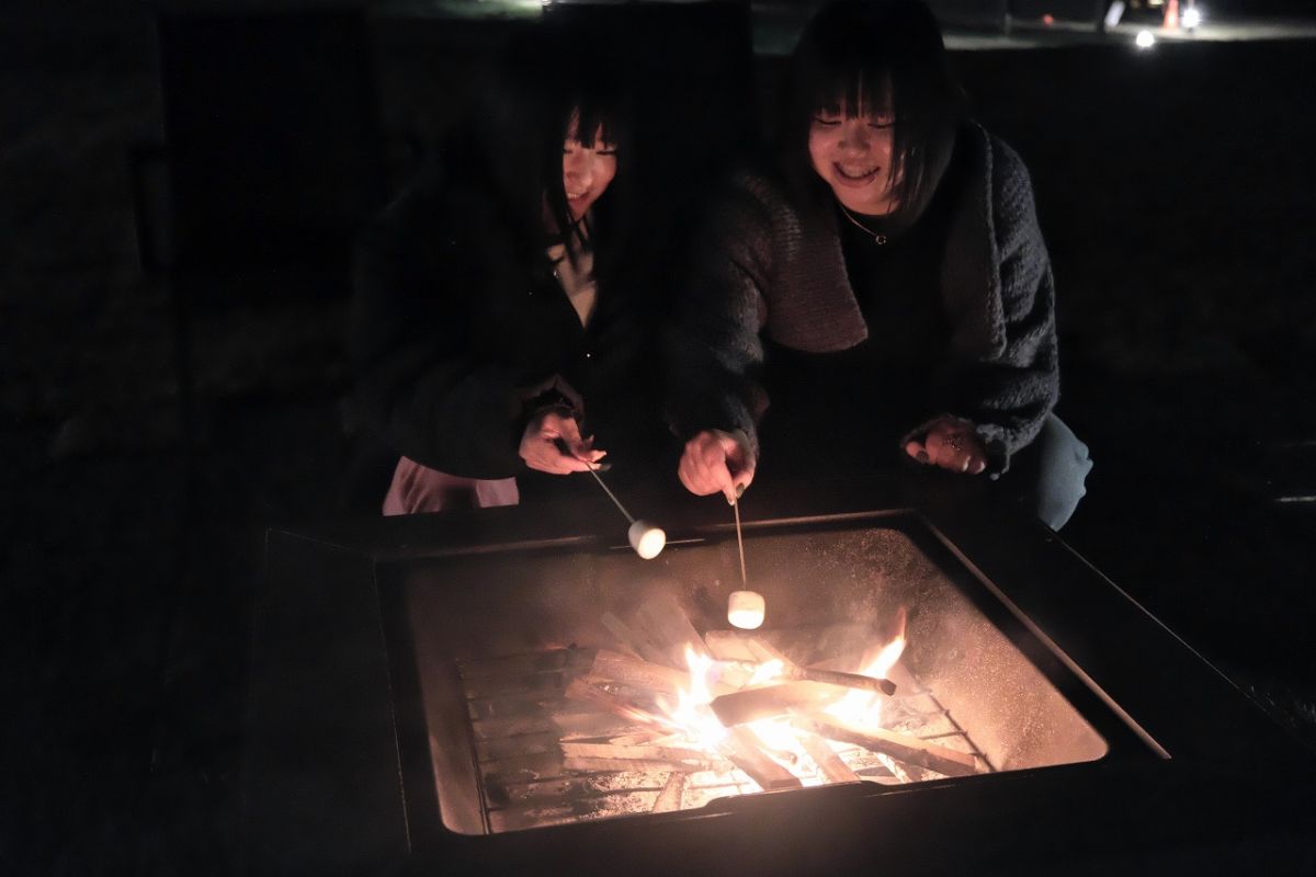 楽しい夕食の後は、base棟の前に設置されたキャンプファイヤーで、焚き火を囲んでおしゃべりタイム。揺らめく炎を眺めているだけで優雅な気分になれます。マシュマロを焼いてチョコレートと一緒に食べる「スモア」のセットも無料で用意されているので、デザートにぜひどうぞ。