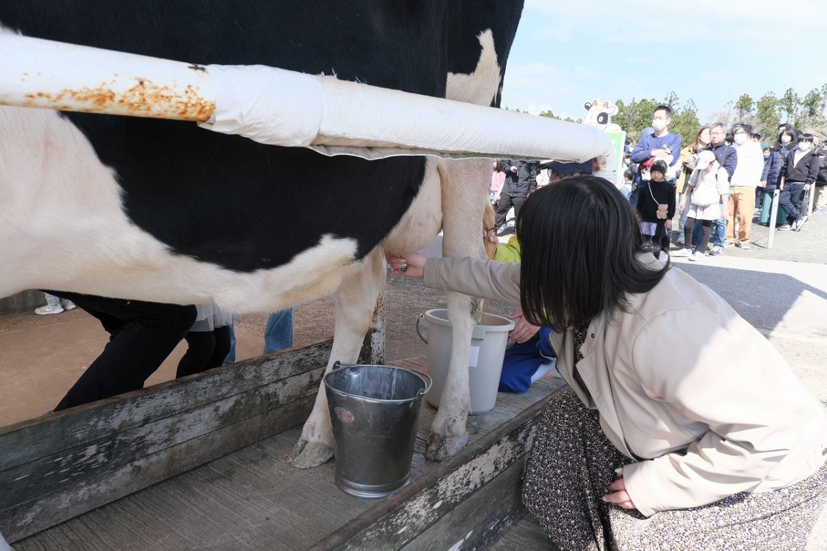 スタッフに教えてもらいながら乳しぼりに挑戦。お乳を付け根からしぼり出すようににぎると、いきおいよくミルクが出てきます。