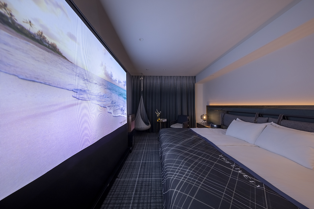 最もベッド幅の広い240cmのキングサイズベッドに、100インチの大画面スクリーン、プロジェクターを設置したコンセプトルーム「シアターキング」。
