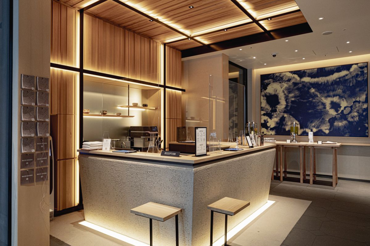 チェックインは、ラウンジの中心となるウェルカムカウンターで。壁面から天井にかけては、ヒノキ材を使用、格子状のライトがモダンな雰囲気を演出しています。カウンターの後ろは、書院造の床の間の象徴でもある違い棚があります。