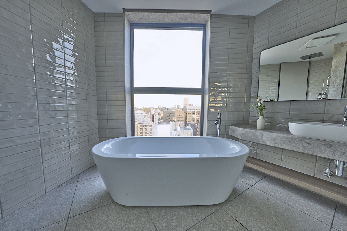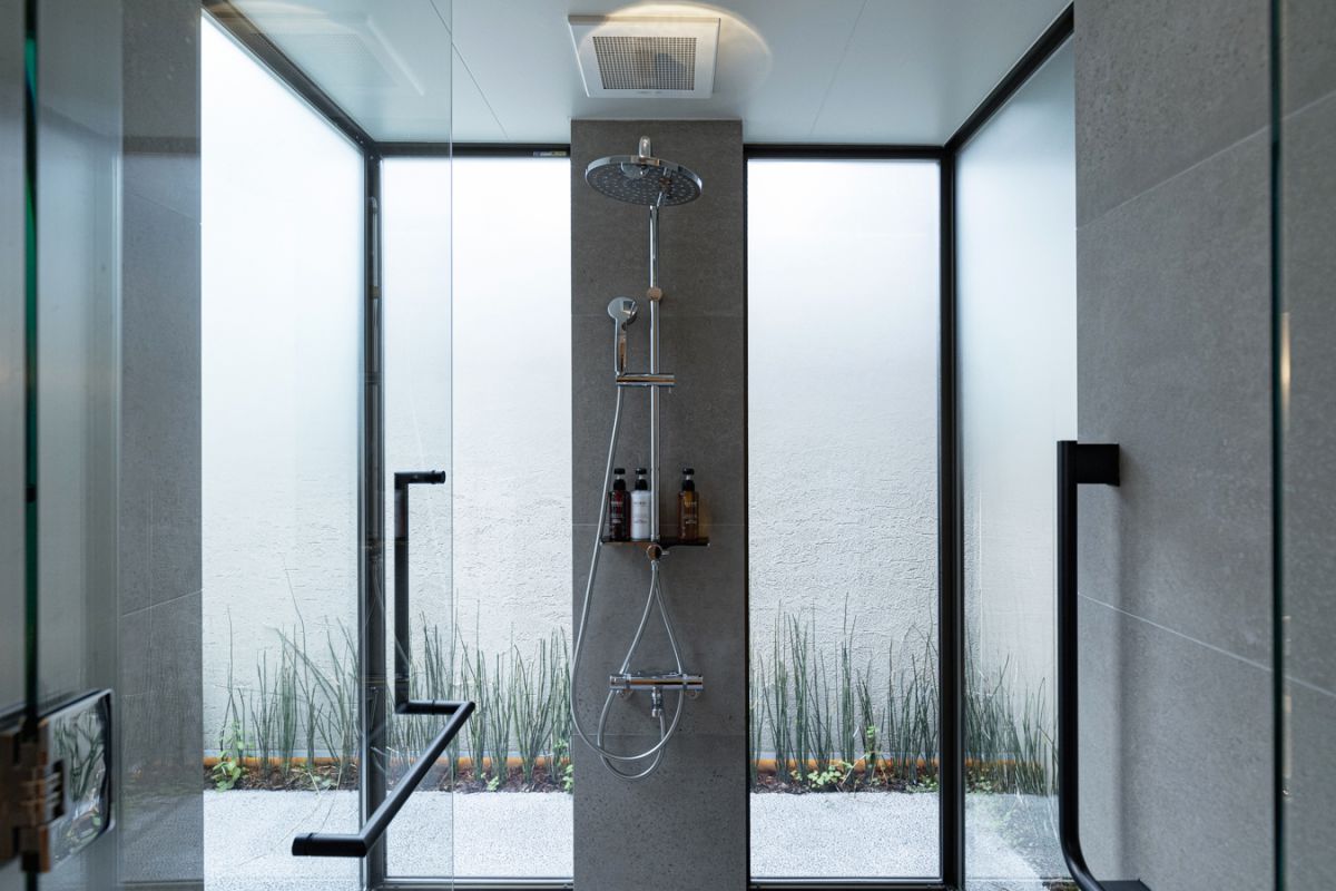中庭に面したシャワールームは、広いスペースと全面窓でとても開放的。レインシャワーも付いているので、やわらかな雨が体を包み込むような心地よさを感じてみてくださいね。