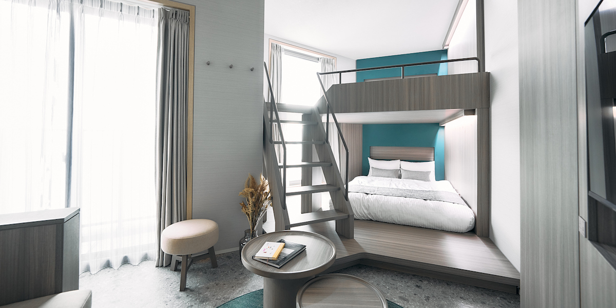 客室はシーンで選べる12種類。全73室ある客室は、元倉庫なだけあり、天井が高く開放感があります。最大4人泊まれる和室タイプの「Superior with Japanese-style」や、3つのバンクベッドを備えた「Moderate Bunk Group」も。6人で泊まれる都心のホテルはなかなかないので重宝しそうですね!ファミリーでの利用も多いそうです。