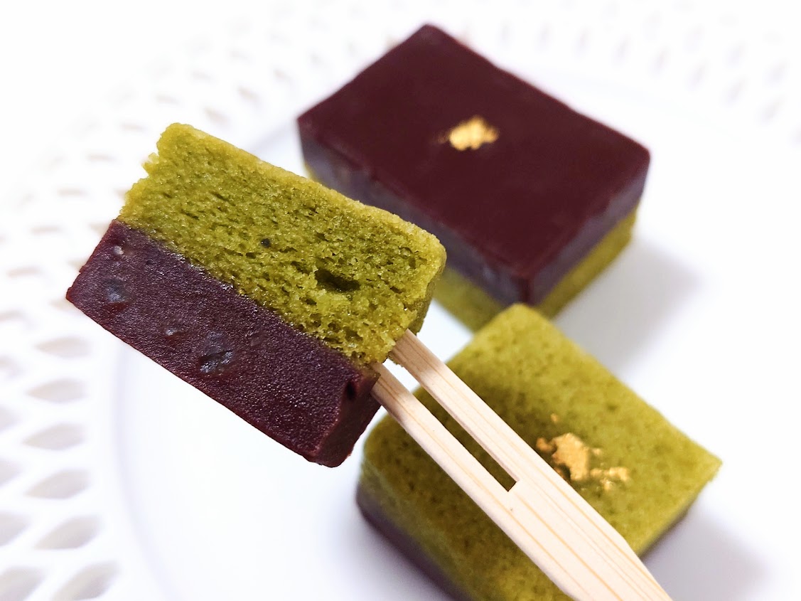 金沢の人気和菓子店、「茶菓工房(さかこうぼう)たろう」の「はなことたろう」は、抹茶カステラの緑とカカオチョコようかんのブラウンがかわいらしいひと口ケーキ。