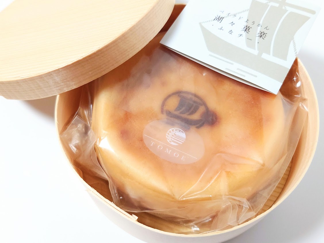 「ベイクドようかん湖々菓楽 ふなチー」は、最近、都内百貨店の催事や特集でも注目されている、昭和7年(1932)創業の滋賀の老舗和菓子店「とも栄(ともえ)」が2023年2月に発売した、一見普通のケーキのように見えるようかんです。