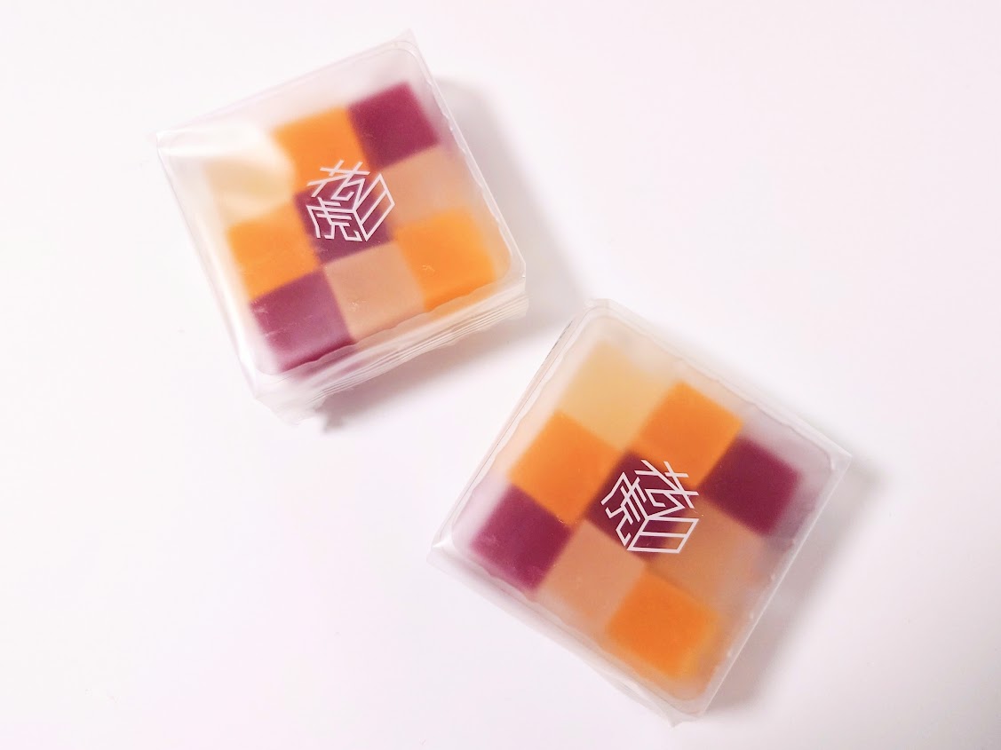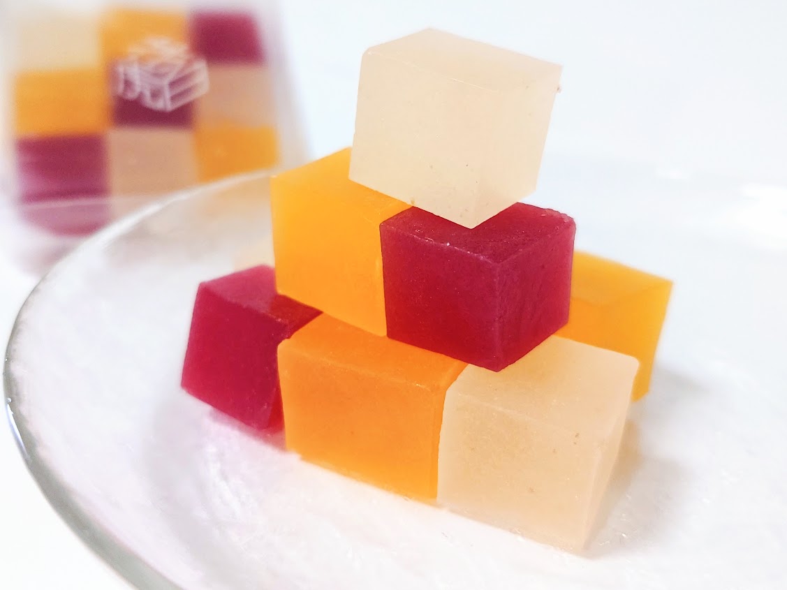 「もみじまんじゅう」で有名な宮島の老舗和菓子店「藤い屋(ふじいや)」が販売している「花虎白(はなこはく)」は、寒天と砂糖を煮詰めて作る伝統の琥珀糖を、鮮やかな色合いとキューブ状のかわいらしい形に仕上げたネオ和菓子です。