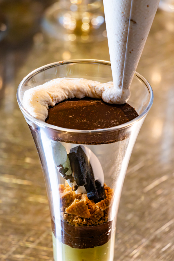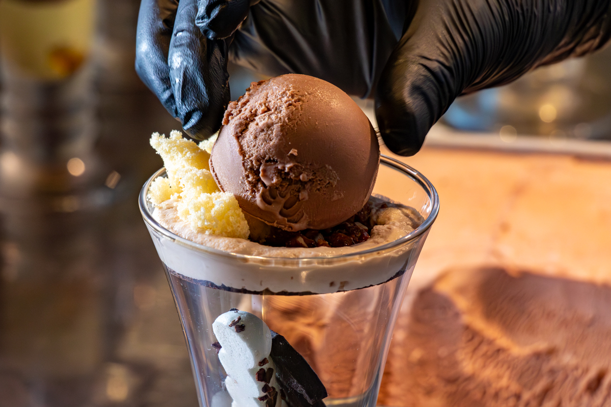 ちょっぴりビターな高カカオのチョコレートジェラートに、香ばしい風味のピスタチオジェラートやアマレットが香るカタラーナなどを合わせた大人の味わい。