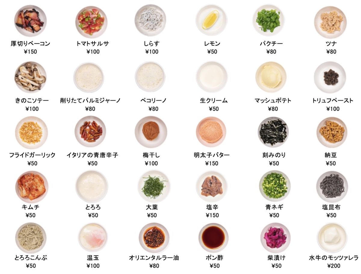 トッピングには「厚切りベーコン」150円や「きのこソテー」100円など、間違いなくパスタに合いそうなものから、「パクチー」80円や「梅干し」100円といったユニークなものまでラインアップ。