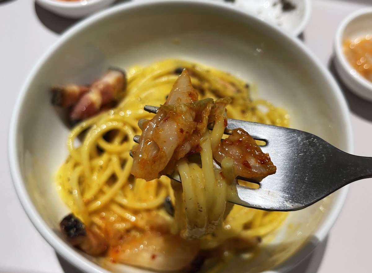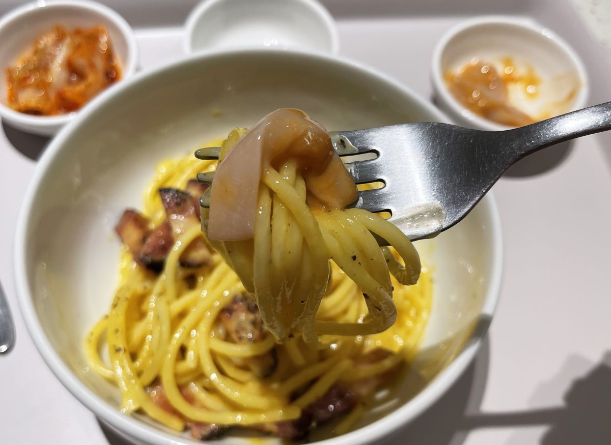 さらに驚いたのが「キムチ」。こっくりと濃厚なカルボナーラに、キムチの程よい辛さや酸味、食感が心地いいアクセントを加えます。
