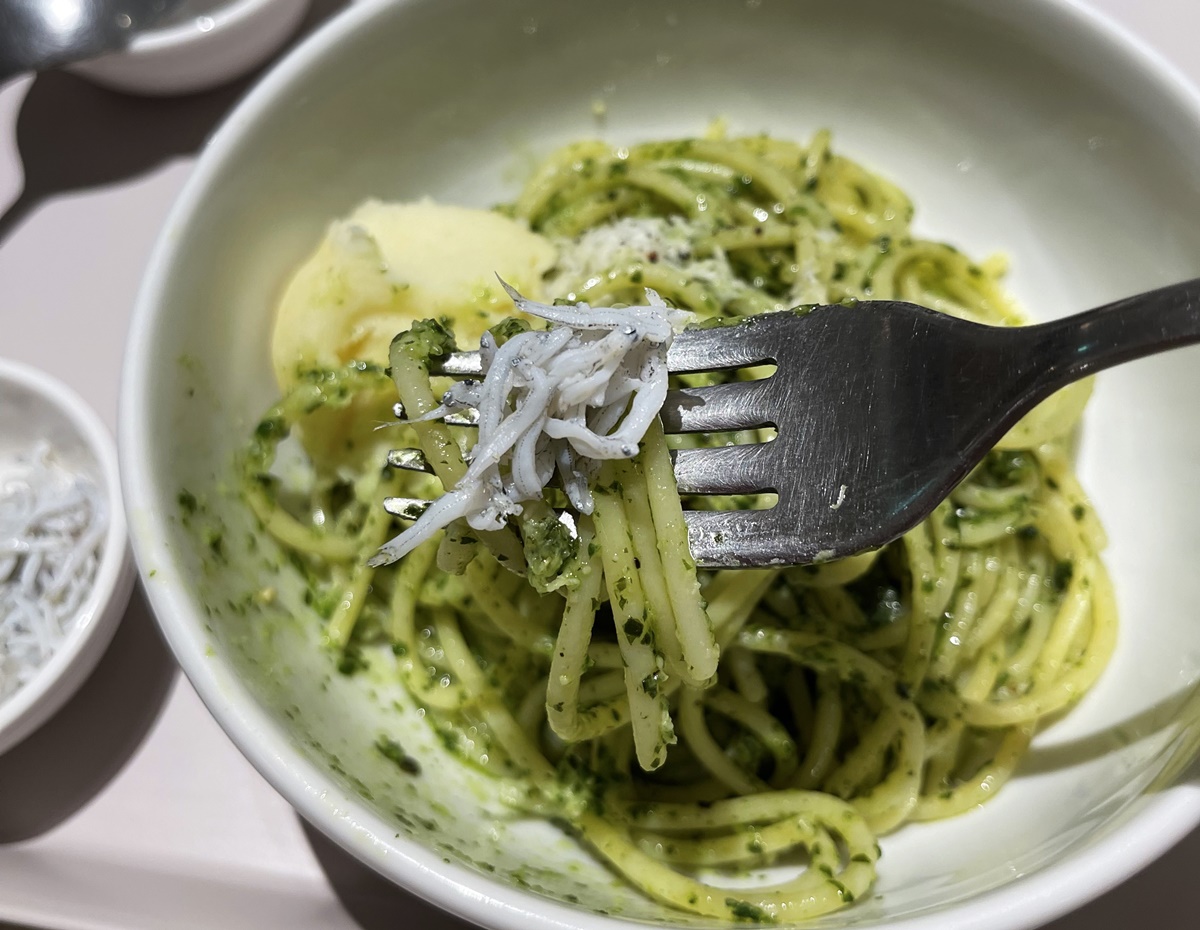 バジルペーストにケールを加え、深みのある味わいに仕上げたジェノベーゼソースと、なめらかな口当たりの「マッシュポテト」や、小さいながらもうま味がギュッと凝縮された「しらす」は相性抜群!