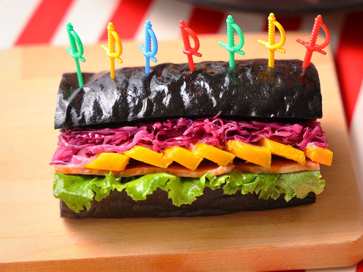 ホテルビュッフェといえば王道の「ローストビーフ」のカッティングサービスのほかに、サンドウィッチやカレーもハロウィンをテーマにしたスタイルで登場していますよ。「スモークミートとカボチャの黒いサブマリンサンドウィッチ」は、色とりどりのかわいらしいピックに黒いバンズが特徴的な一品。