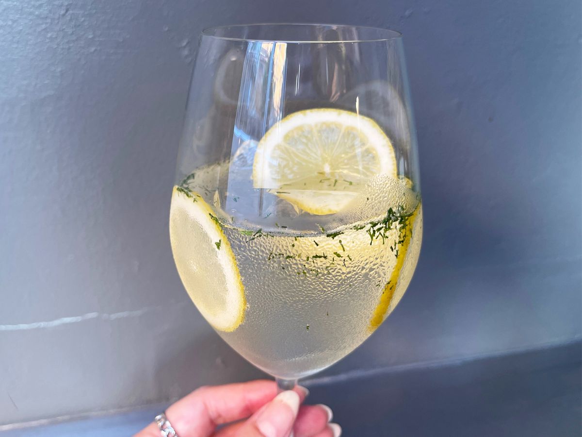 「自家製ディルシロップのレモネード」は、ディルやミント、ローズマリーなどのハーブを使用した自家製シロップと、スライスした有機レモンとの組合わせが見た目にもさわやかなドリンク。