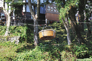 厳美渓に来たら、名物・空飛ぶ団子もぜひ! 磐井川にかかる天工橋(てんぐばし)たもとの休憩所で、籠にお金を入れて木板を叩くと、対岸の茶屋からケーブル伝いに名物の「かっこうだんご」が飛んできます。