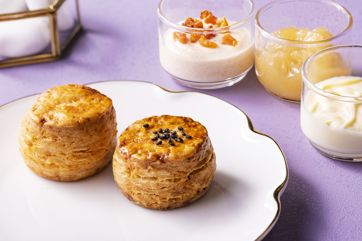 コンディメントには、クロテッドクリームのほか、和梨とノンアルコールの白ワインを合わせたさわやかな後味のジャムと、北海道産マスカルポーネの味わいの中に、富有柿の甘さが引き立つクリームを用意。スコーンとコンディメントは好きな組み合わせで味わいましょう。