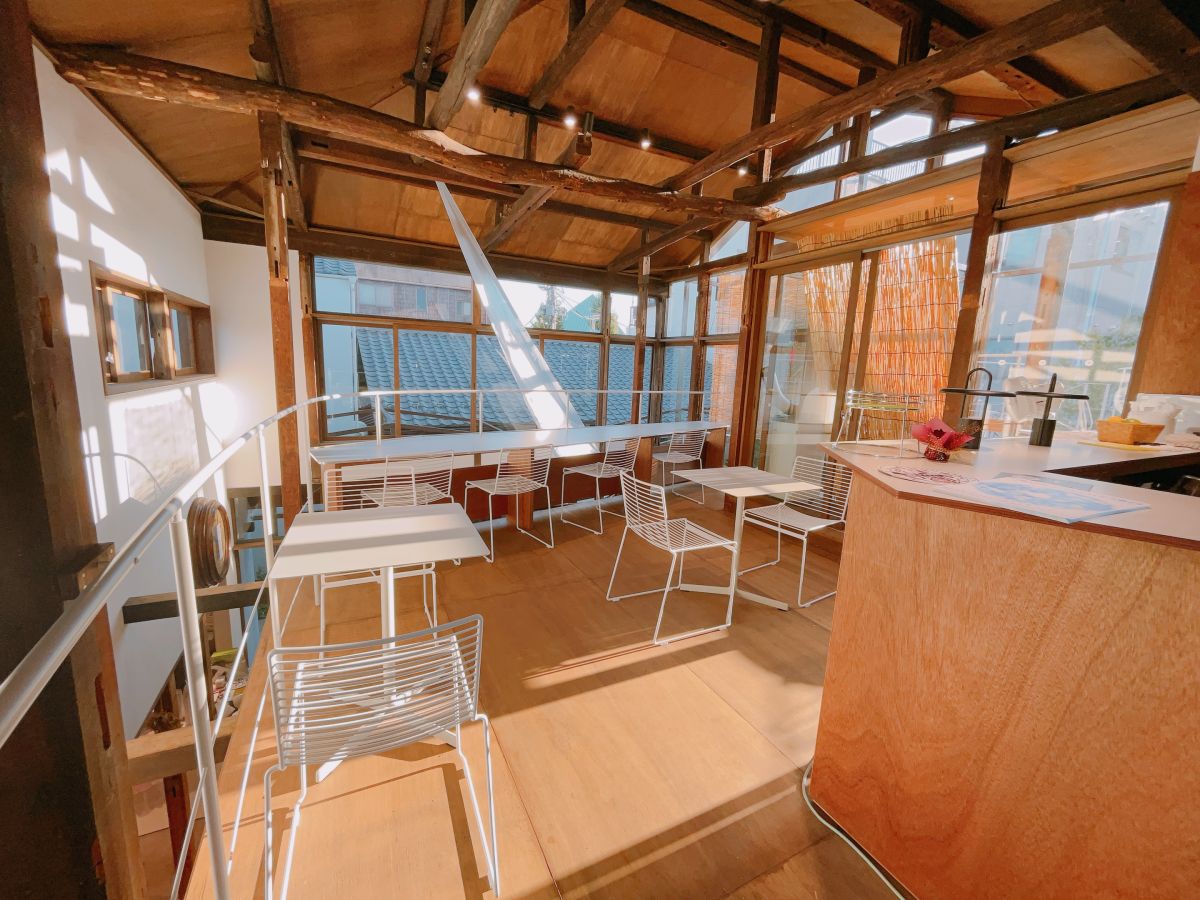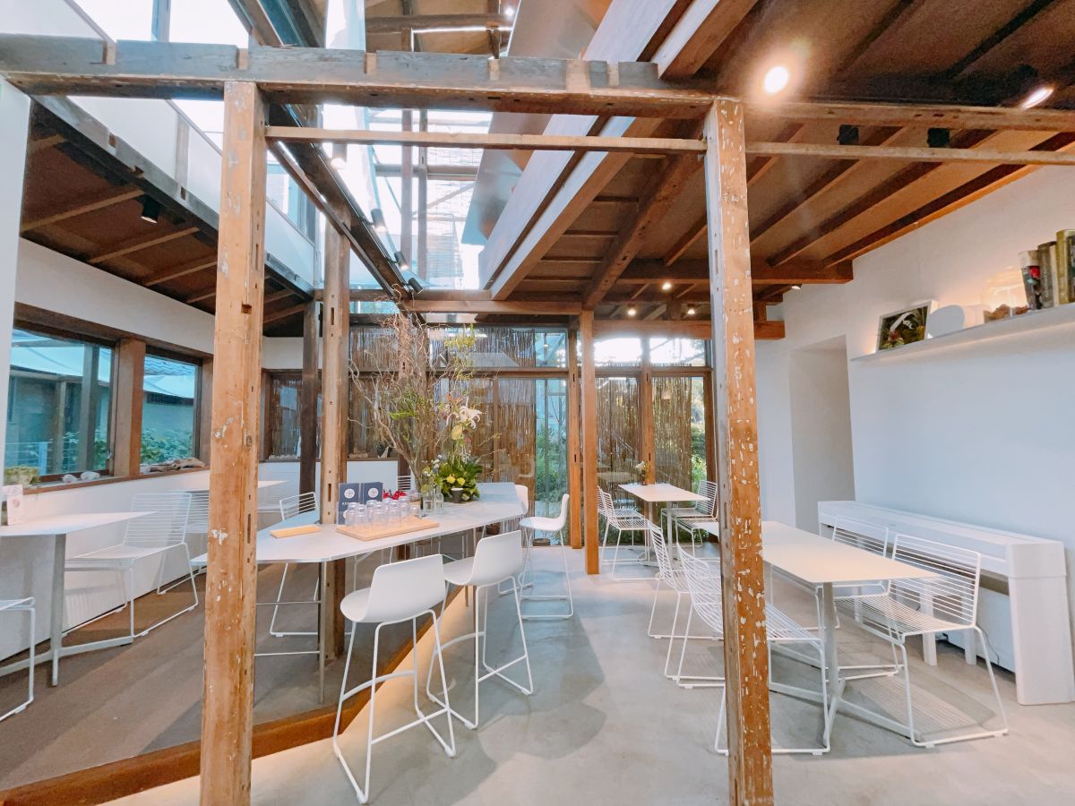 店内は白を基調としたモダンなインテリアと、昔の姿をそのまま生かしたレトロな木の柱が共存する不思議な空間。2階が吹き抜けとなっており、壁一面に設置された大きな窓からはたっぷりと自然光が差し込みます。元々は「花重」の従業員の住まいだったそう。2年半かけて改築を行い、現在の姿へと生まれ変わりました。