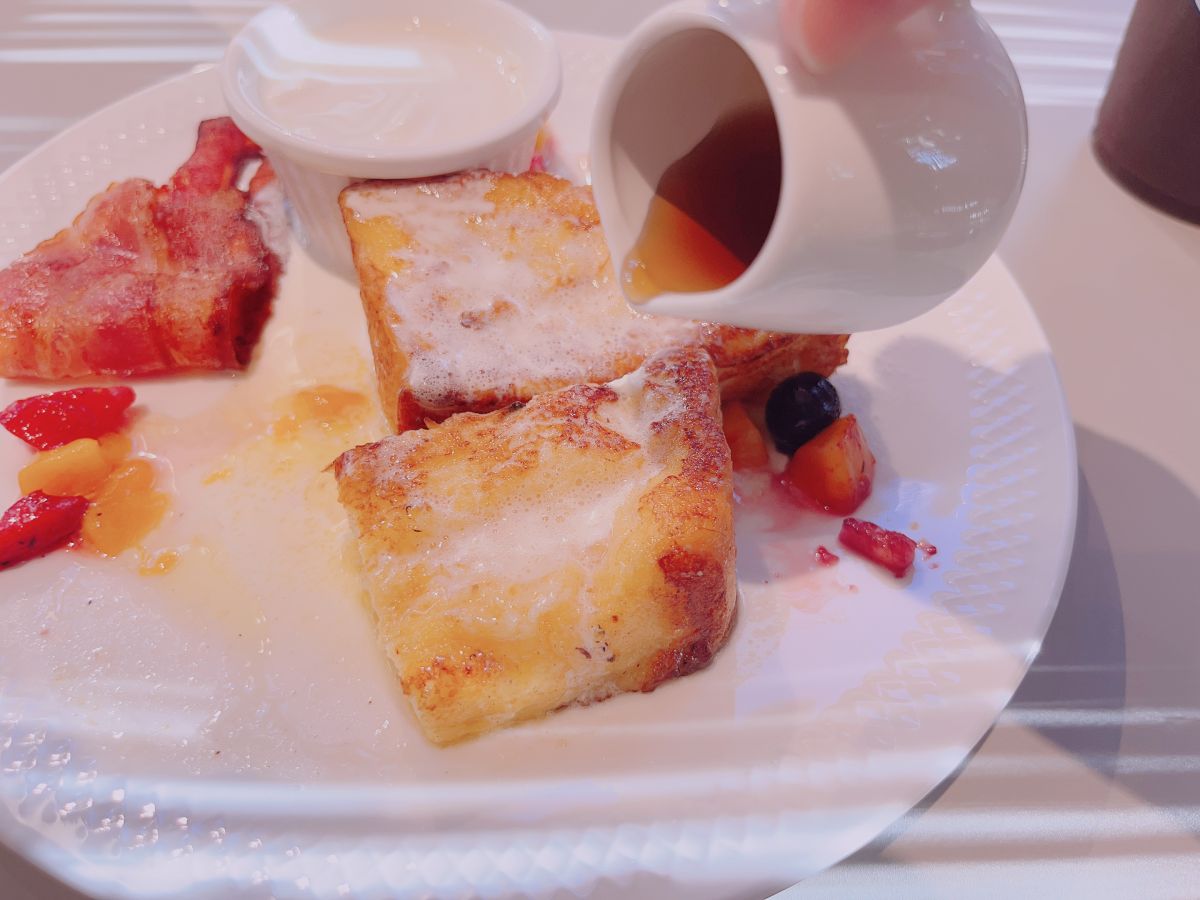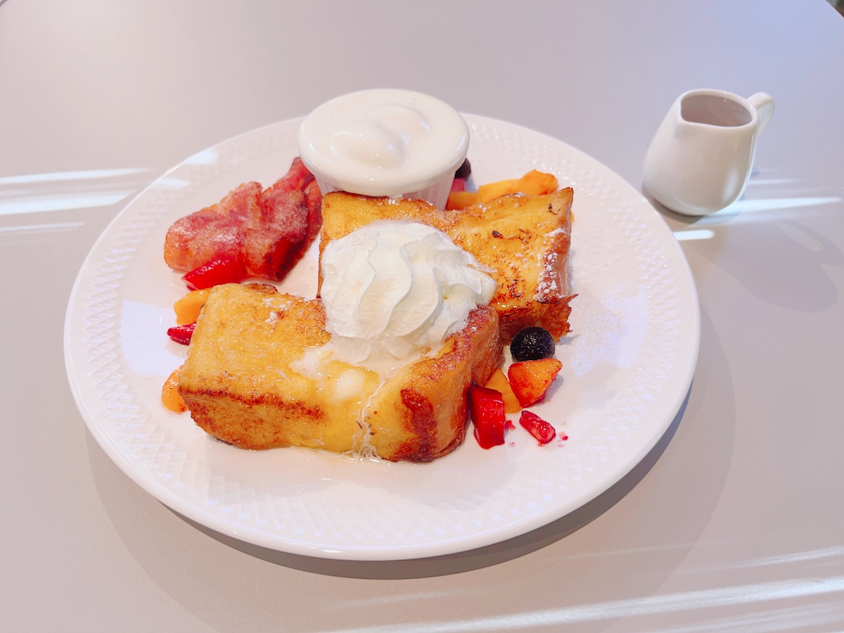 甘さをプラスしたいときは別添えのメープルシロップをかけて味変をしましょう!食事とデザート、両方の楽しみ方をしてほしいというお店の思いから、ひとつのプレートにメープルシロップ、生クリーム、アイスクリーム、ベーコン、ベリーなどをのせています。フレンチトーストとベーコンを合わせると食事に、そのほかをトッピングすればデザートに。気分や好みに合わせて組み合わせてみてくださいね。