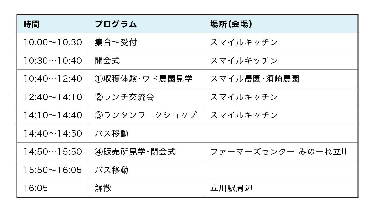 収穫体験と農園見学の後には、「スマイルキッチン」で、立川など多摩地域の食材を使ったお弁当をいただきます!実際に畑にふれ、農作物についての理解が深まったあとにいただくフレッシュな食材が詰まったランチは、おいしさもひとしおです。ランチタイムでは、農家の方との交流会も実施。「スマイル農園」「須崎農園」をはじめ、植木農家や花農家の方から直接話を聞くことで、多摩地域の地産食材や人々の魅力を実感しながら農家が抱えている課題について改めて考えるきっかけになりそう。