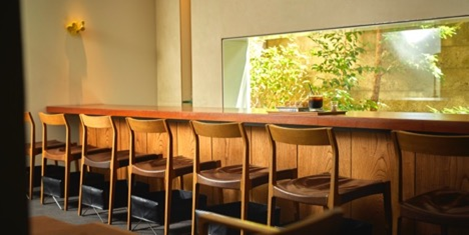 店内に入って、一番に目を引くのは、一枚板のカウンターテーブル。横長に切り取られた窓から見える庭の緑が目にやさしく、落ち着いた雰囲気を醸し出しています。