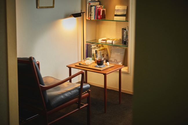 しかし、この空間を生かしたのが、おひとりさま専用席。スポット照明が手元を照らし、書斎のような雰囲気。革張りのソファに深く腰をおろして、本棚のアート本を眺めたり、読書をしたり。観光シーズンを除けば、地元のおひとりさま率は高く50%以上。向かいの美術館を鑑賞した余韻に浸りながら静かな時間を過ごしているお客さまも多いそうです。