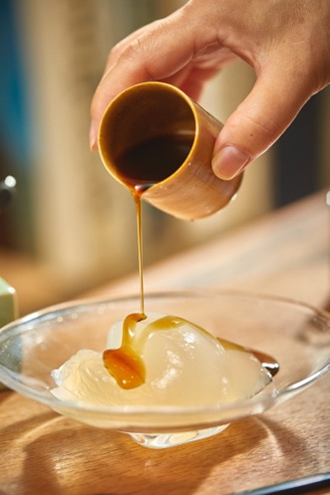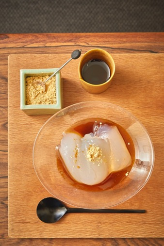 自家製の黒糖シロップをとろりとかけていただきます。上質な葛でできたぽってりとした餅は舌ざわりがよく、ほどよい軟らかさ。別添えのきな粉も香ばしく、お好みでかけると味の変化を楽しめます。