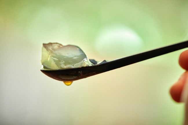 ぷるんと透明なくずもちの涼しげな姿、ひんやりとした口あたりのよさ、蜜とともに口の中に広がるおいしさに癒やされます。
