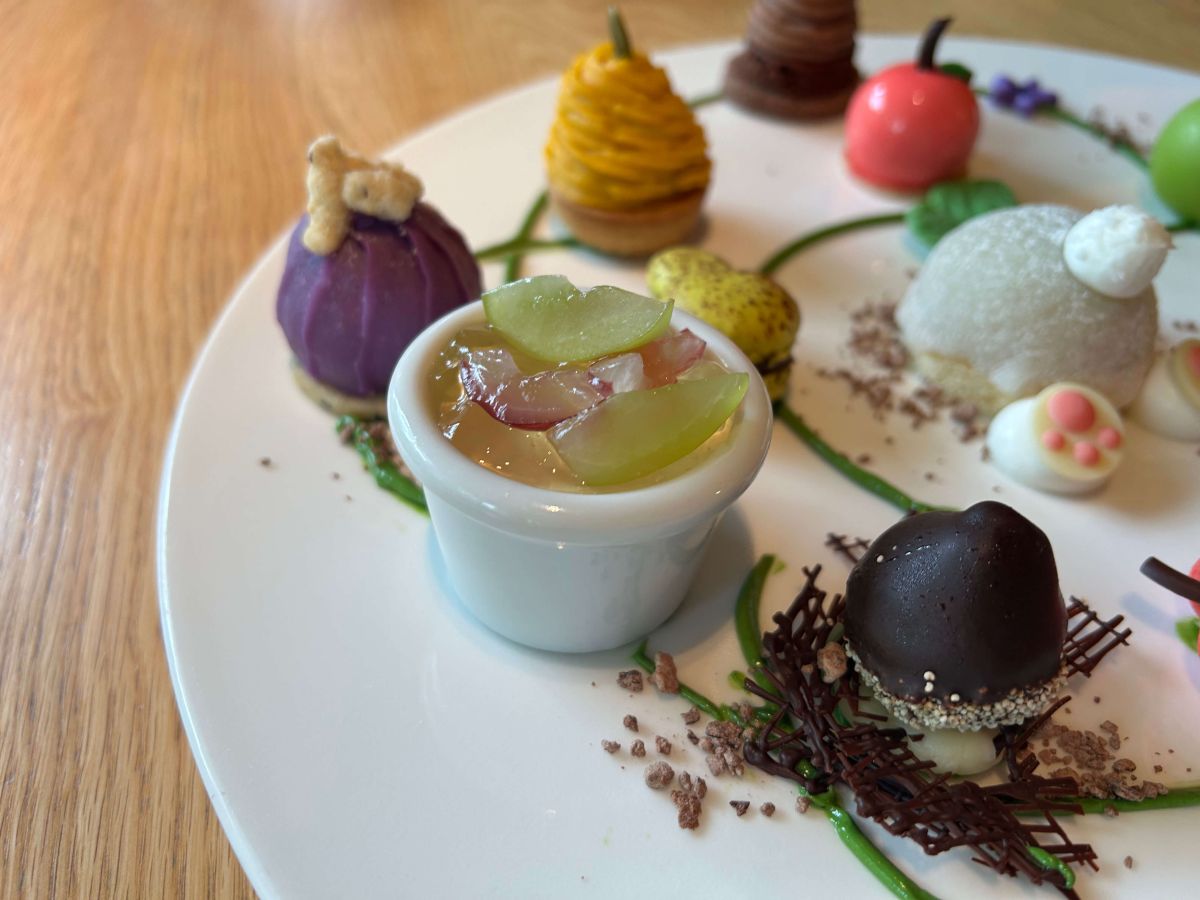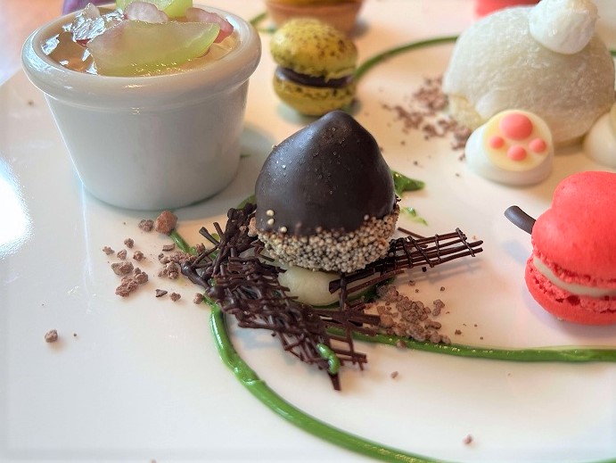 器に入った「ぶどうのジュレとヨーグルトパンナコッタ」は、こっくりとした味わいが多いプレートの中で、あえてさっぱりとした甘みを大切にしている一品。パンナコッタにかかっているワイン風味のジュレは、ノンアルコールのシャルドネを使っており、ホテルメイドの完成度の高さが伺われます。