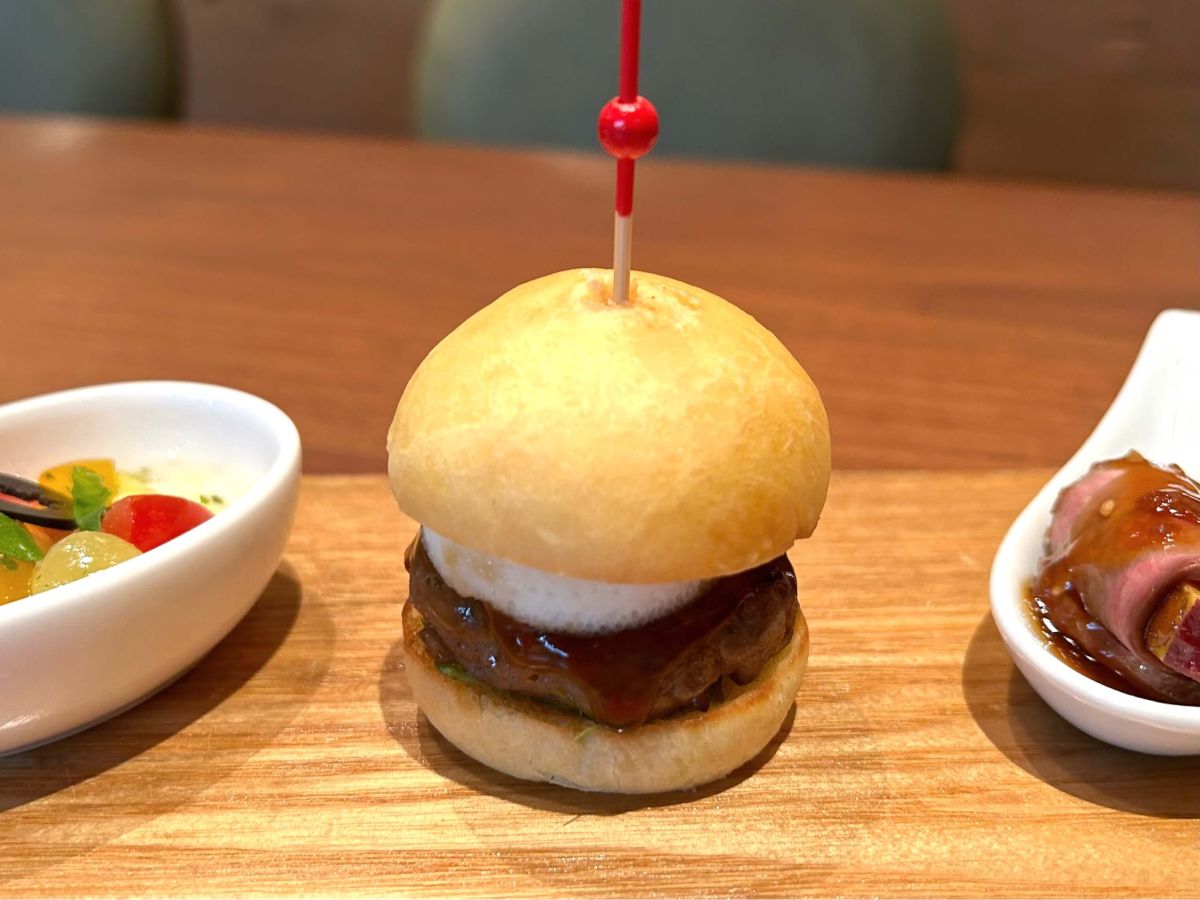 筆者のイチオシは「ミニお月見バーガー」。うずらの卵でミニチュアに作られた目玉はちゃんと半熟になっているこだわりよう。大葉の風味がほんのりと感じられ、香ばしさのある和風ソースでいただきます。