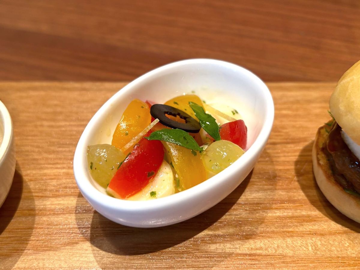 「KURIごはん」は、蓋を開けた途端、ふわっとジャスミン米と栗の香りが鼻をくすぐる、秋の香りを堪能するために生まれたかのような洋風の栗ごはん。その隣にあるのが、ぶどうのフレッシュさをぜいたくにサラダ仕立てで楽しめる「ぶどうとトマトのカプレーゼ」です。