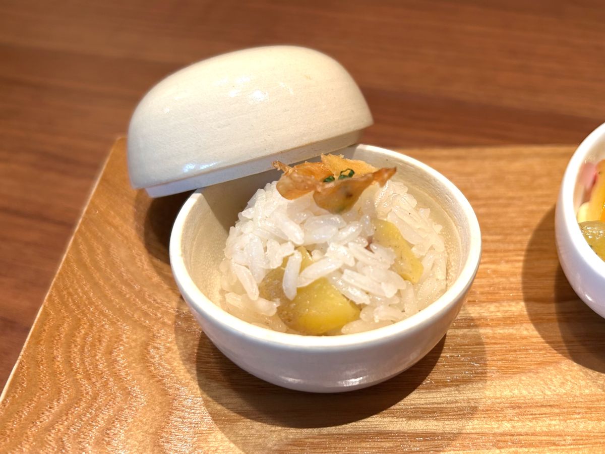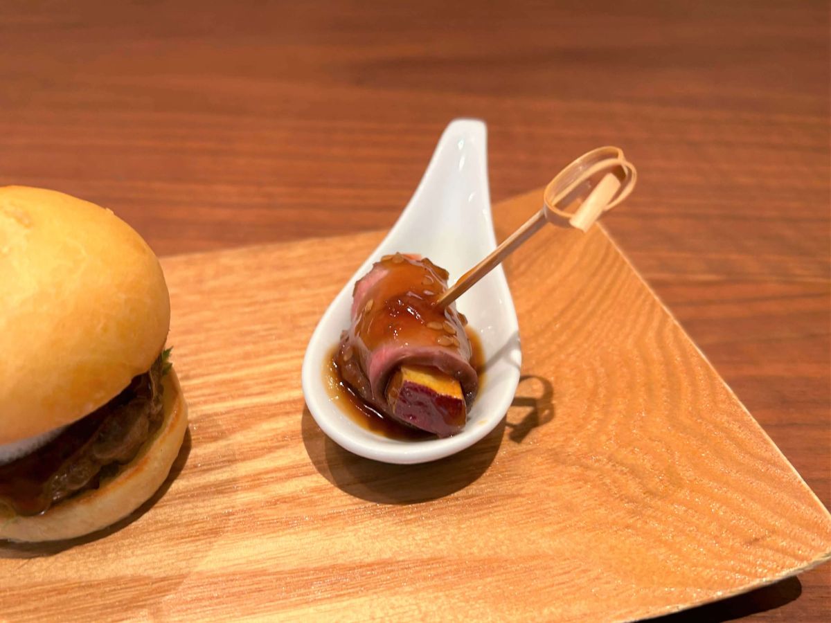 「合鴨と大学芋のブロシェット」は、大学芋の食感が想像の3倍はカリカリです。やわらかな合鴨との食感のコントラストはもちろん、芋の甘さと合鴨のしょっぱさがクセになるセイボリーです。