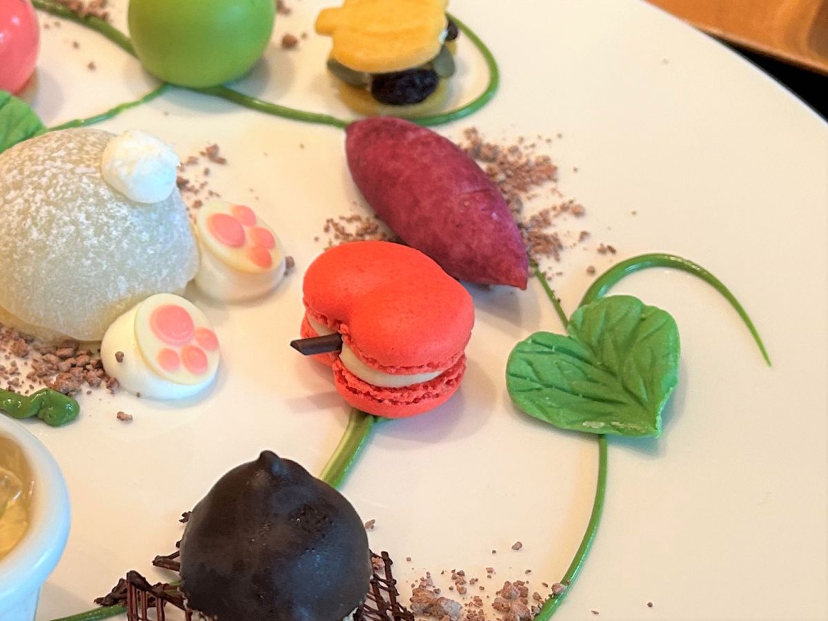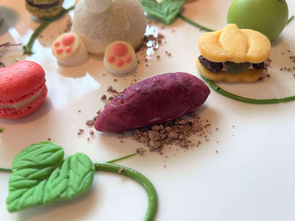 お皿に描かれたさつまいものツルにつながるようにして並ぶスイーツの数はなんと全部で12種類!通常よりかなり品数が多くなっているんです。試作でどれもおいしかったからあれもこれもと採用することになったのだそう…!その代わり、どのメニューもひと回り小さいサイズで構成されています。好きなものをちょっとずつ…うれしすぎる!それぞれの味をレポートしていきます。