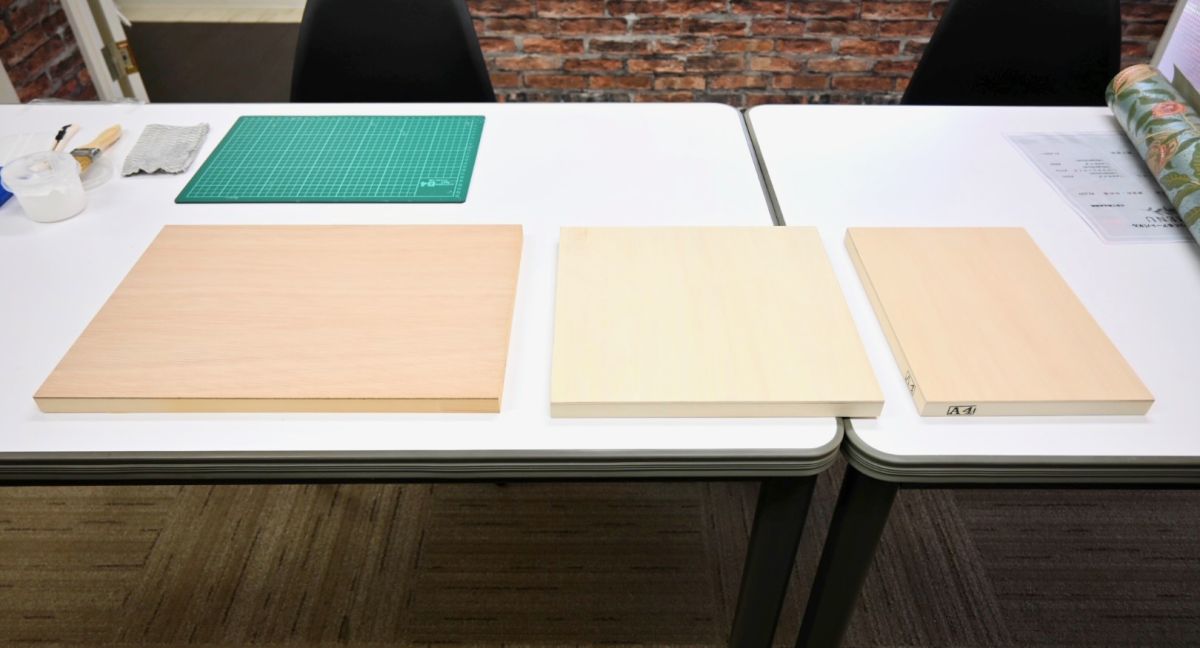 はみ出た部分を切り落とし、最後にタッカー(建築用ホッチキス)で壁紙をパネルに固定します。タッカーを使ったことがない人には練習をさせてくれるので安心。しっかり扱えるようになったら本番です。