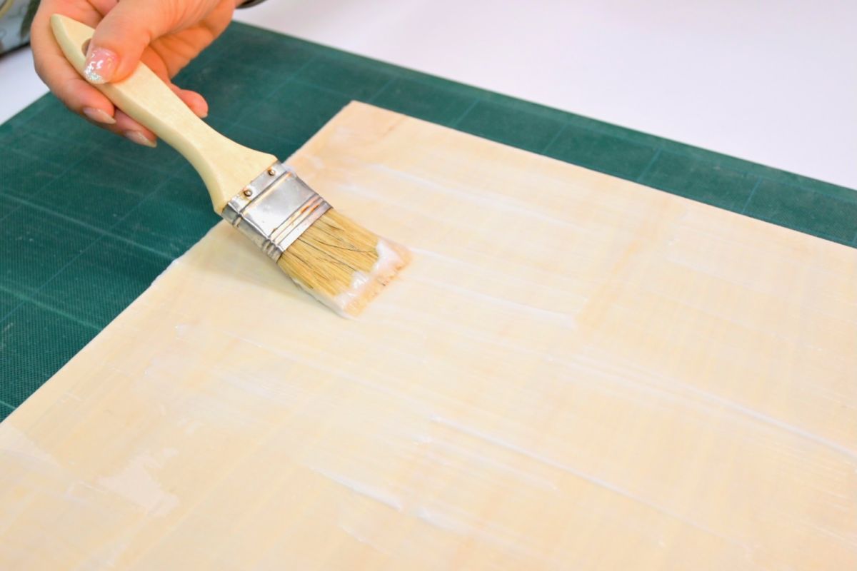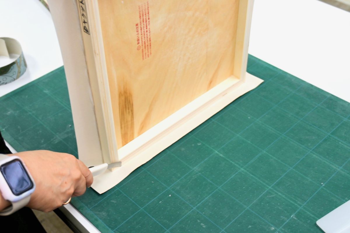 次は壁紙をアートパネルのサイズに合わせてカット。パネルに壁紙用ののりを刷毛で塗り、でき上がりをイメージしながら、壁紙をパネルに貼り付けます。どこを切り取るかで印象も変わるので、少し緊張する作業です。