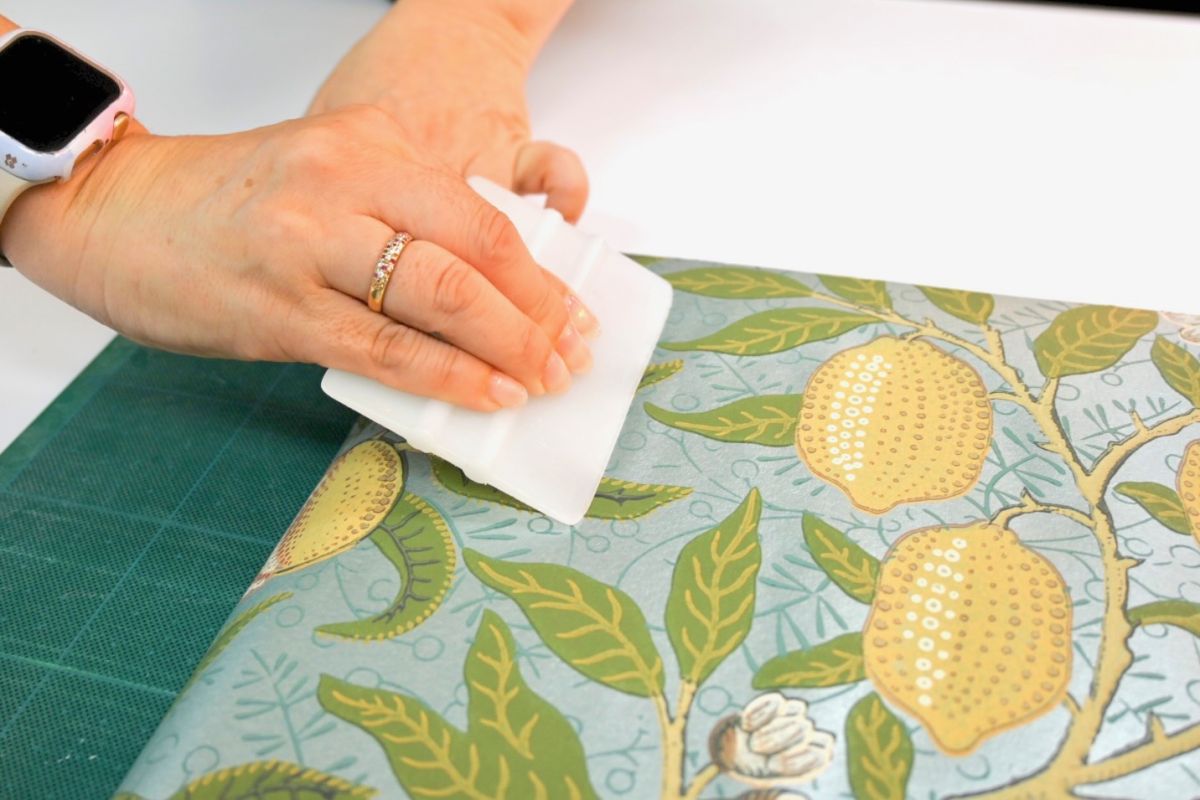 壁紙を貼り終えたら、次は壁紙とパネルの間にある空気を抜きます。縦横と方向を変えながら何度も何度も空気を出していきます。