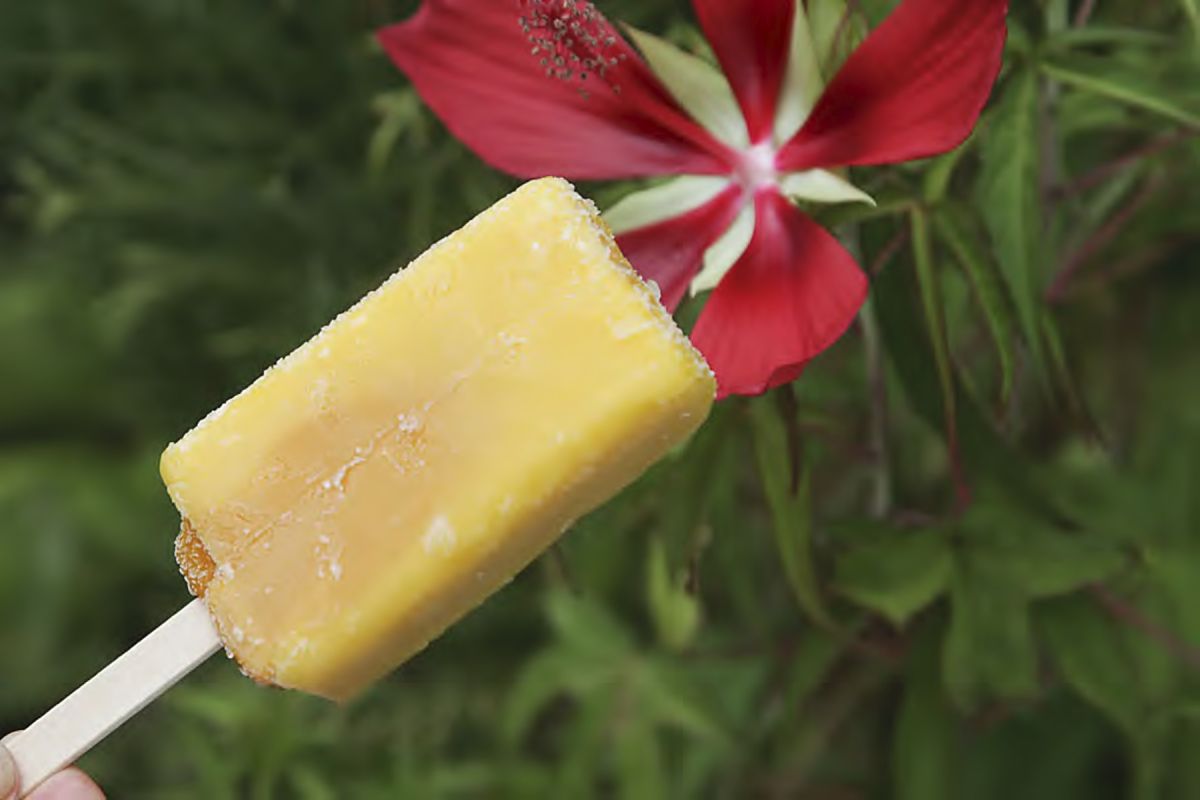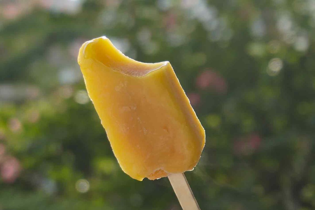 内側の濃いオレンジ色の部分は、甘みも強く、より濃厚。1本のアイスバーのなかに、2種のマンゴー果汁を閉じ込めることで、味わいに奥行きが出て、とても満足感のある1本になっています。
