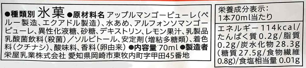 パッと見ではわかりにくいかもしれませんが、バーの中心分が濃いオレンジ色で、外側は明るめのオレンジ色になっています。これは内側にアルフォンソマンゴー果汁を使用し、外側にアップルマンゴー果汁を使用しているから。