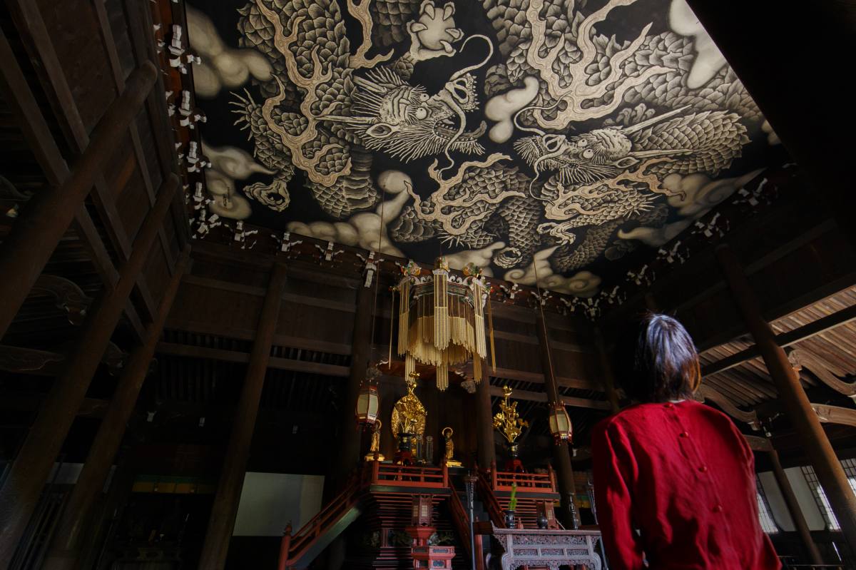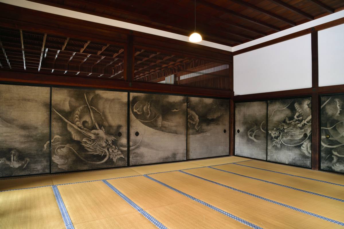 方丈の中ほどにあるのは雲龍図の襖絵です。約400年前に海北友松が描いたもので、かつては最初にお客様を通す礼の間に置かれていました。繊細なタッチの背景や体とは裏腹に、豪快で力強い目が印象的です。こちらも複製なので撮影OKです。