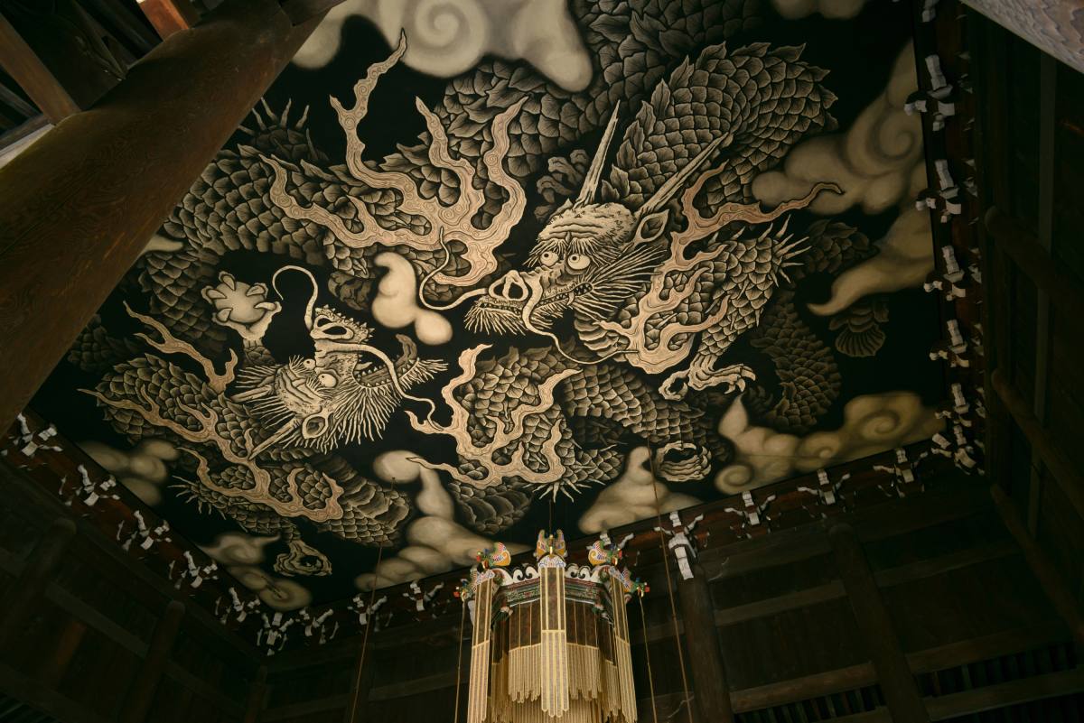 法堂の天井にある迫力満点の双龍図は、建仁寺創建800年を記念して平成14年(2002)に小泉淳作が描いたものです。古来より龍は水の神として仏法の教えの雨(法雨)を降らせるたとえから、禅宗の法堂に描かれることが多いそう。実際に見るとその大きさと迫力に圧倒されます。