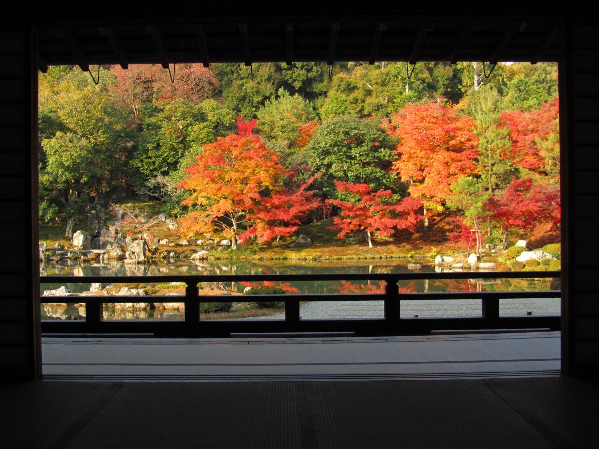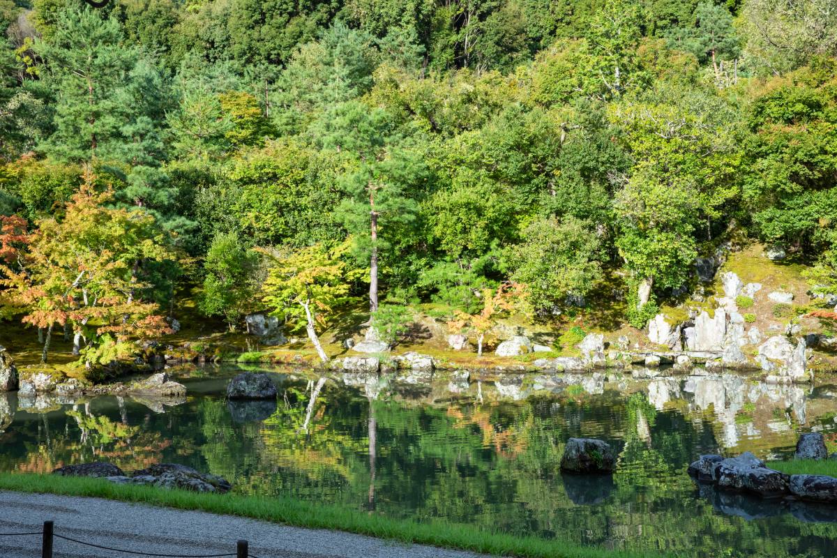 まずは、世界的にも有名な曹源池庭園。中央に曹源池を配した池泉回遊式庭園で、庭の後方に広がる嵐山や亀山を取り込んだ借景式庭園でもあります。
